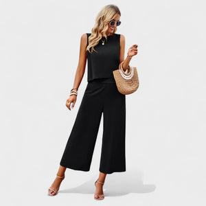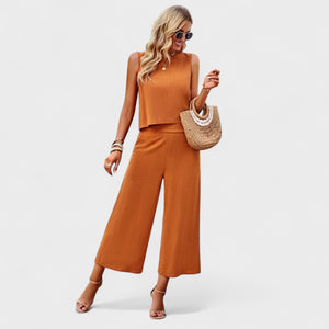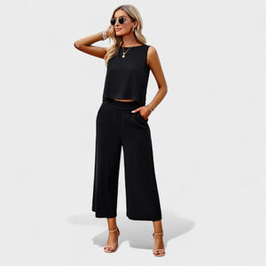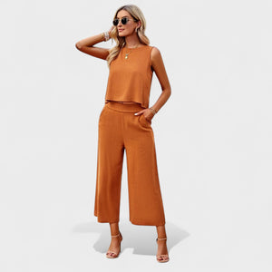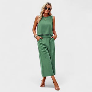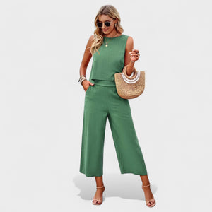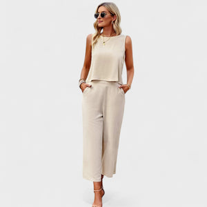 Este conjunto de lino es la elección perfecta para quienes valoran la elegancia sin esfuerzo. Con un top sin mangas de corte recto y pantalones rectos de cintura alta, ofrece un aspecto moderno, fresco y extremadamente cómodo.