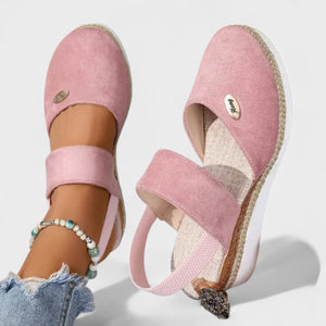 Estas sandalias con cuña son el equilibrio perfecto entre comodidad y estilo. Con un diseño moderno y femenino, ofrecen una base estable, un elástico para un ajuste práctico y una plantilla suave que acompaña el movimiento del pie. El tono nude y los detalles en yute y corcho las hacen ideales para looks casuales elegantes, desde paseos de fin de semana hasta eventos al aire libre.