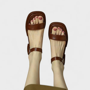 Con líneas simples y un diseño atemporal, estas sandalias marrones de tiras anchas y punta cuadrada son el esencial perfecto para el verano. Elegantes y versátiles, se adaptan a cualquier ocasión — desde la oficina hasta un paseo de fin de semana — manteniendo siempre un aspecto sofisticado y cómodo.