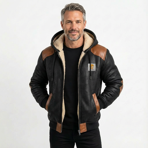 La cálida chaqueta vintage de ante y cuero con capucha combina calidez, estilo y autenticidad para un look robusto y elegante.