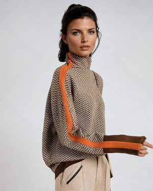 El suéter Amaya una sofisticación moderna y comodidad , con tejido de punto cálido , cuello alto y patrón geométrico que equilibran moda y comodidad . Una prenda versátil y única para mujeres elegantes.