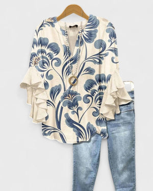 El blusa Angela destaca por su tejido ligero y aireado, ideal para mantener frescura en todo momento. Su estampado floral en tonos azules y los volantes en las mangas aportan un toque delicado y femenino. Con escote en V y caída fluida, favorece la silueta con naturalidad. Una prenda versátil y cómoda para lucir estilo sin esfuerzo.